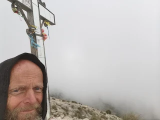 I'm back on El Cielo. There's only a little wind now, but the view isn't great either: I'm stuck in the clouds.